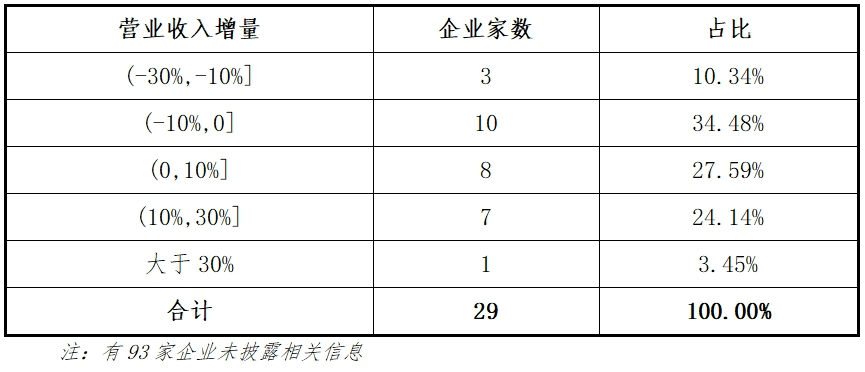 2024年采用上市标准一的122家IPO终止项目企业仅有29家披露营业收入数据,2023年营业收入平均数为1073902.66万元,中位数为112357.10万元,营业收入最高的新特能源达到3075179.57万元。29家企业营业收入增量的分布如下表: