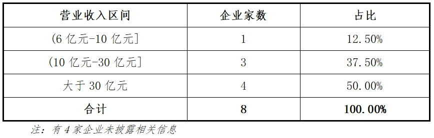 这8家企业2023年营业收入均超过60000万元;其中有3家在100000万元与300000万元区间,占比37.50%;有4家超过300000万元,占比50.00%。营业收入最高的江南新材达到681750.96万元。8家企业营业收入的分布如下表: