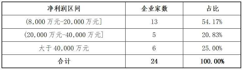 这24家企业2023年净利润均超过8000万元,其中有5家在20000万元与40000万元区间,占比20.83%。净利润最高的国货航达到115455.62万元。24家企业净利润的分布如下表: