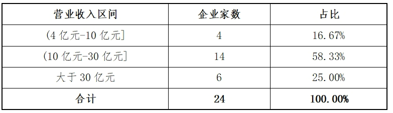这24家企业2023年营业收入均超过40000万元,其中20家在100000万元以上,占比83.33%,营业收入最高的龙旗科技达到2718506.40万元。24家企业营业收入的分布如下表: