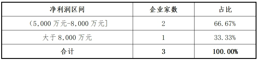 2024年受理的3家企业2023年净利润均超过50000万元;其中有2家在5000万元与8000万元区间,占比66.67%。净利润最高的中国铀业达155292.48万元。3家企业净利润的分布如下表: