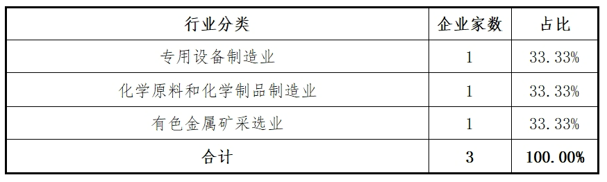 沪深主板2024年受理的3家企业共涉及3个细分行业,分别为:专用设备制造业(1家)、化学原料和化学制品制造业(1家)、有色金属矿采选业(1家),行业分布情况如下表: