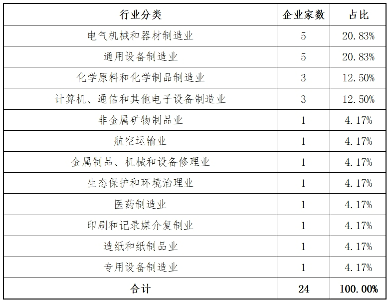 沪深主板2024年上市的24家企业共涉及12个细分行业。主要的行业分别为:电气机械和器材制造业(5家)、通用设备制造业(5家)、化学原料和化学制品制造业(3家)、计算机、通信和其他电子设备制造业(3家),合计占全部上市企业的66.67%。行业分布情况如下表: